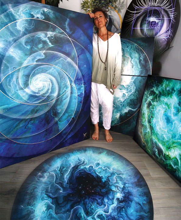 «La peinture acrylique est ma technique de prédilection car diluée à l’eau elle porte l’information, l’eau conductrice d’énergie transmet la vibration sur ma toile, je souffle et brule les couleurs qui s’écoulent puis j’interprête les lignes et contrastes à la peinture à l’huile et feuilles d’or pour trouver la quintessence, l’équilibre et l’harmonie.»